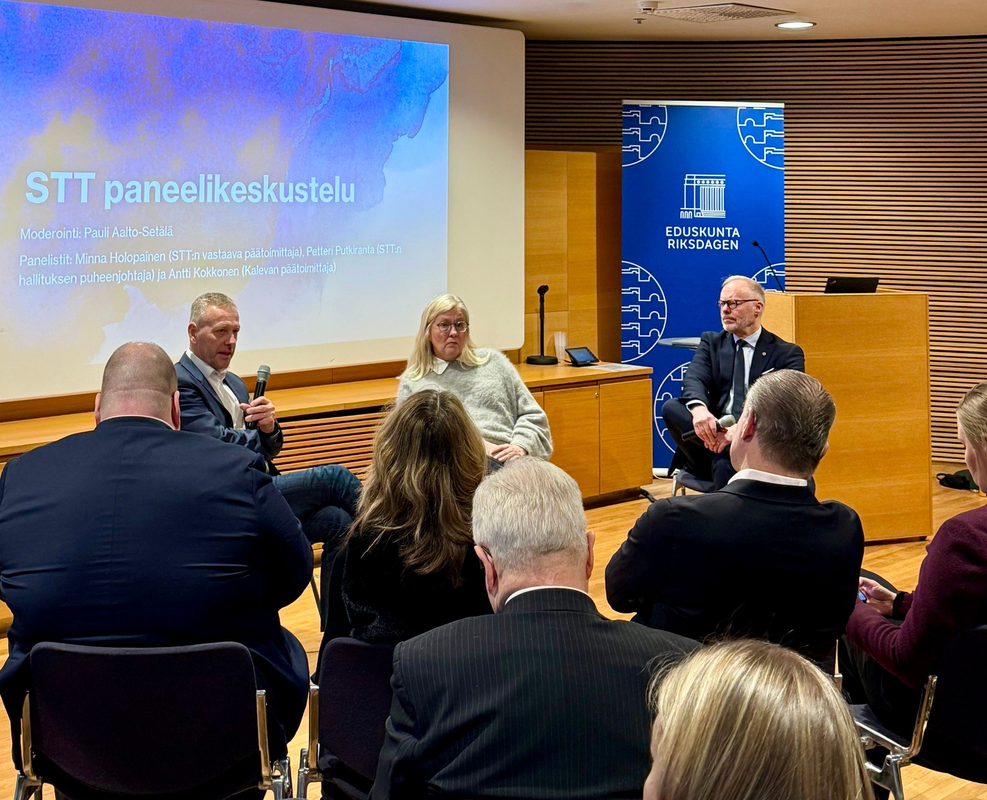 Ensimmäiseksi teemaksi valitsin uhanalaisen ja ainoan tietotoimistomme, STT:n, jonka päätoimittaja Minna Holopainen ja hallituksen puheenjohtaja Petteri Putkiranta osallistuivat kanssani paneeliin.